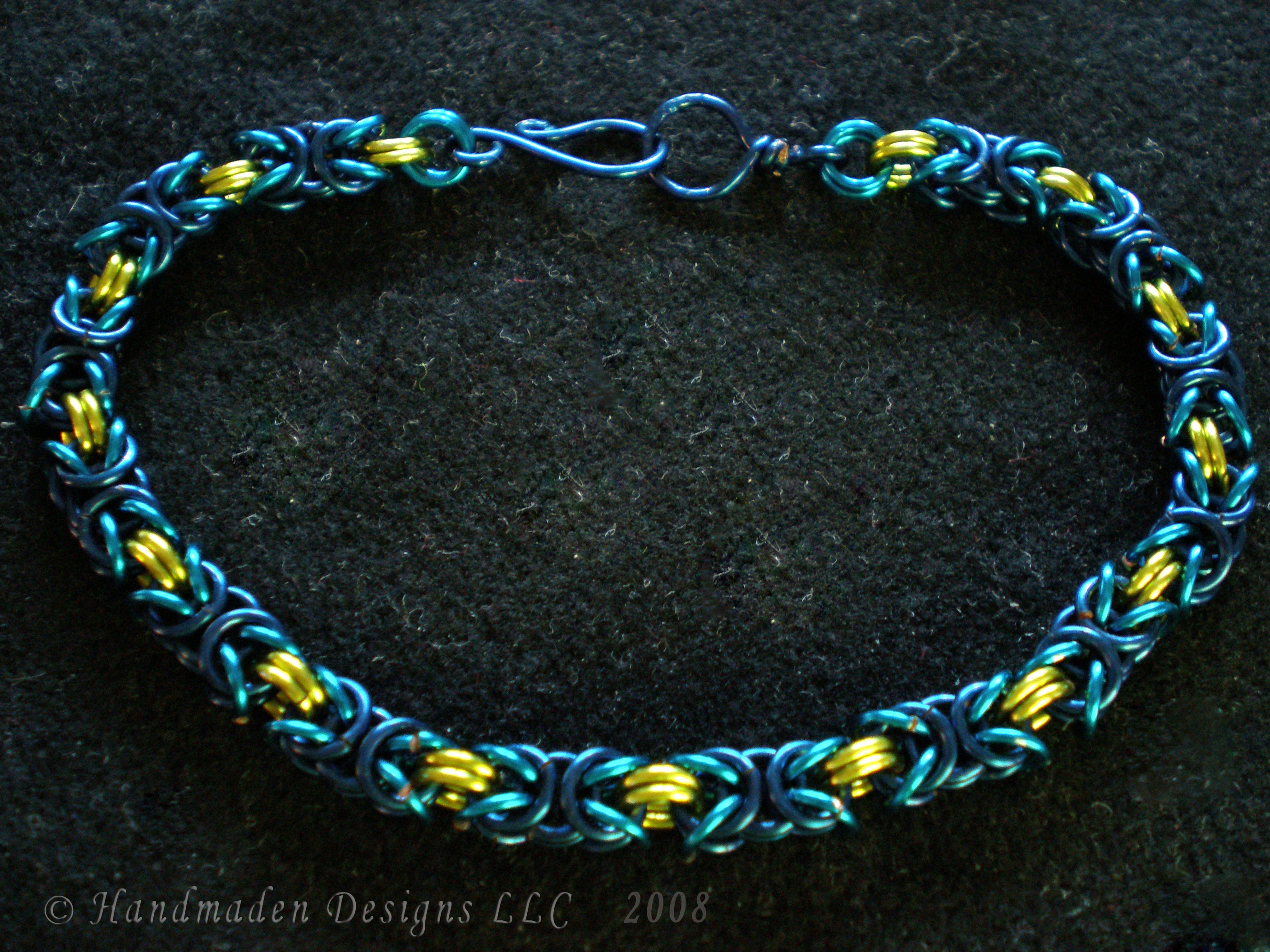 Enameled copper (lime green, dark blue, and peacock blue) Byzantine bracelet.